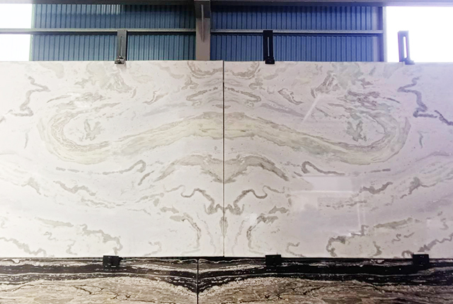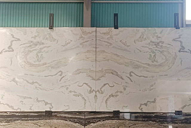 在水一方大理石,靜謐而優雅,充滿詩意的水波紋路,讓人感到平靜放鬆。既是藝術品也是電視牆/餐桌/檯面的好選擇!巧妙將兩塊在水一方大理石拼接,很有雙龍獻瑞的壯麗豪華氣息,適合想呈現高雅華麗的氛圍空間選用。