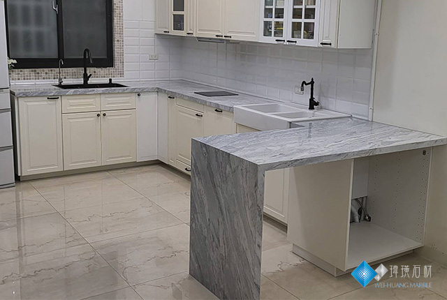 選用冰川藍打造的流理檯以及中島檯,別緻質感,打造出明亮舒適的下廚空間