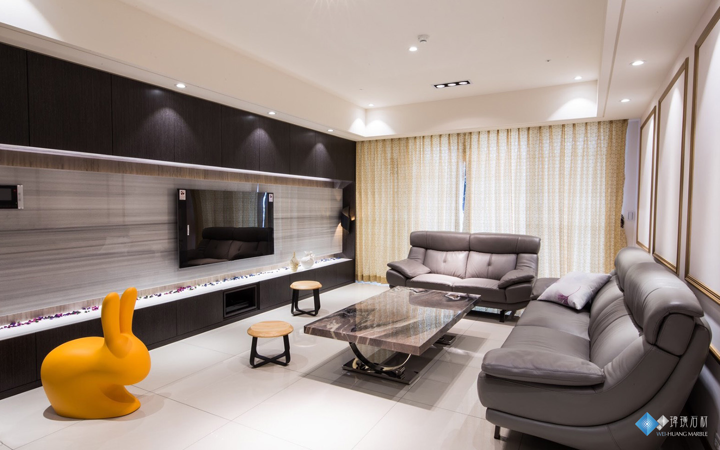 高雅內斂,時髦低調,是常見的大理石色系,石材因深灰淺灰色的不同,每一種都有不同氛圍,也能顯示出空間主人的不同個性。經常被作為電視牆使用,豐富流動的紋路,為空間帶來十足生命力。推薦給喜歡沉靜平衡的你,不想太沉的黑也不想太白的白色系,就選他吧!